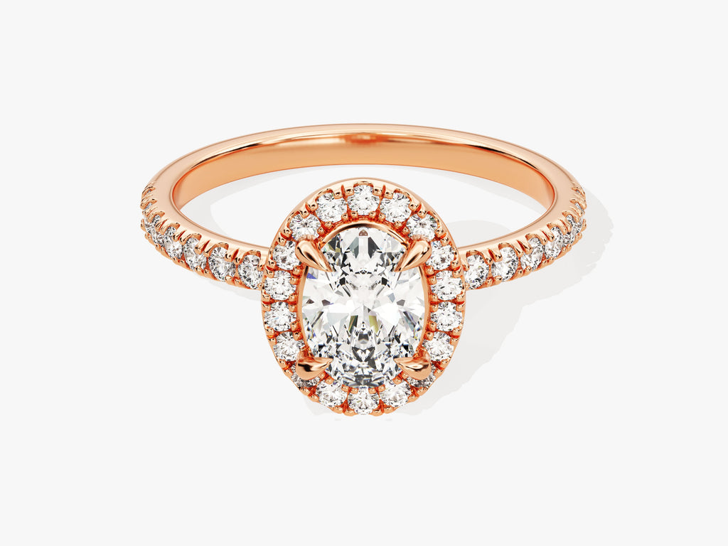 Prepare to be captivated by the elegance of our Oval Halo Lab Grown Diamond Engagement Ring with Pave Set Side Stones, a masterpiece that seamlessly blends classic charm with modern opulence. This extraordinary ring features a brilliant oval-cut lab-grown diamond, meticulously crafted to enhance its exceptional clarity and captivating allure. The delicate halo and pave set side stones add an extra layer of shimmer and sophistication to the ring.