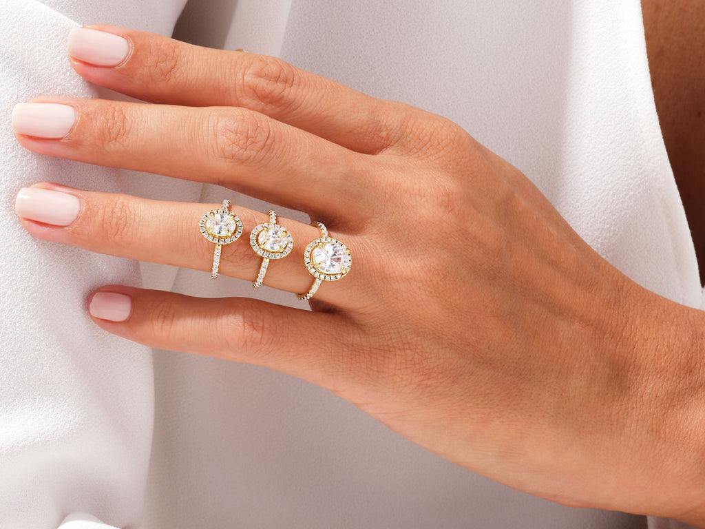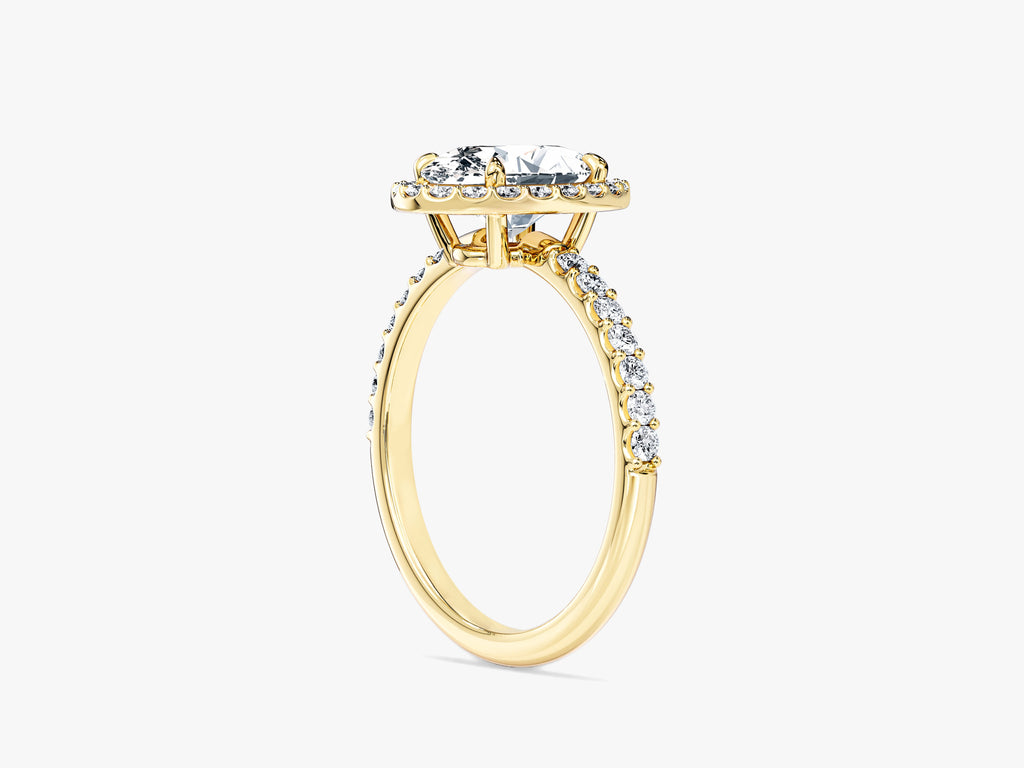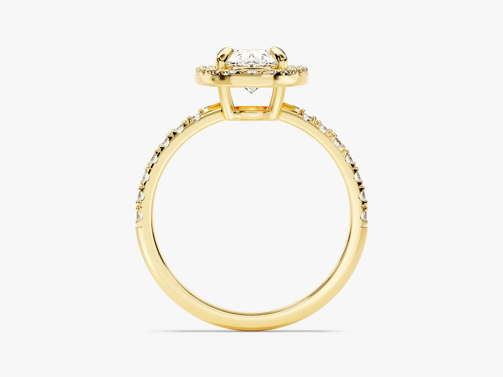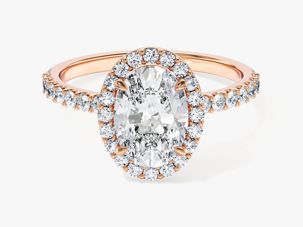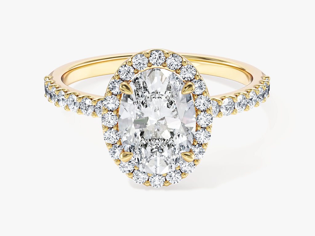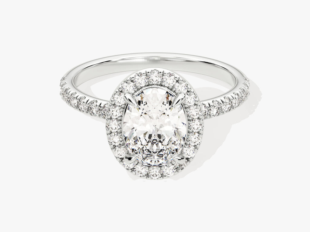 The Oval Halo Moissanite Engagement Ring with Pave Set Side Stones is a truly enchanting and opulent symbol of love and commitment. At its core, this exquisite ring features a brilliant oval-cut moissanite, renowned for its elongated shape and remarkable brilliance. The central oval moissanite is elegantly encircled by a halo of smaller stones, creating a radiant and captivating aura around it.