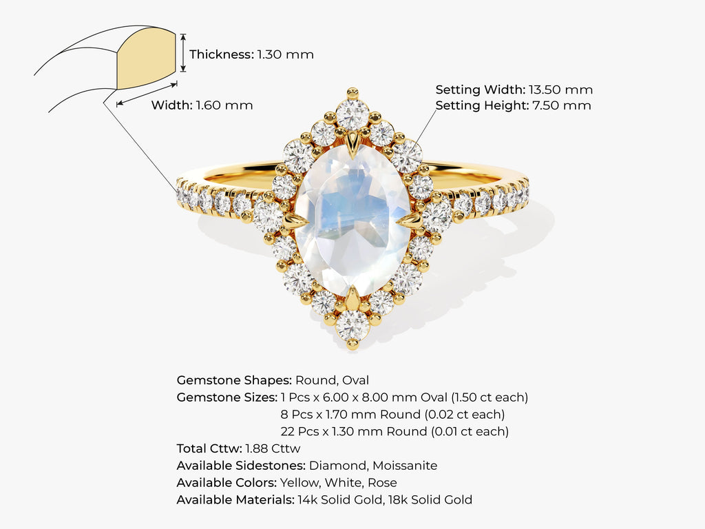 Embark on a journey of celestial elegance with our Oval Halo Moonstone Engagement Ring‚ timeless symphony of lunar inspiration and everlasting love. The enchanting oval-cut moonstone, with its ethereal glow reminiscent of moonlit nights, takes center stage. Encircled by a halo of brilliant moissanite gemstones, this ring captures the celestial beauty and sophistication of a moonlit halo.