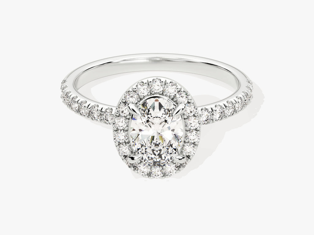 Prepare to be captivated by the elegance of our Oval Halo Diamond Engagement Ring with Pave Set Side Stones, a masterpiece that seamlessly blends classic charm with modern opulence. This extraordinary ring features a brilliant oval-cut diamond, meticulously crafted to enhance its exceptional clarity and captivating allure. The delicate halo and pave set side stones add an extra layer of shimmer and sophistication to the ring.