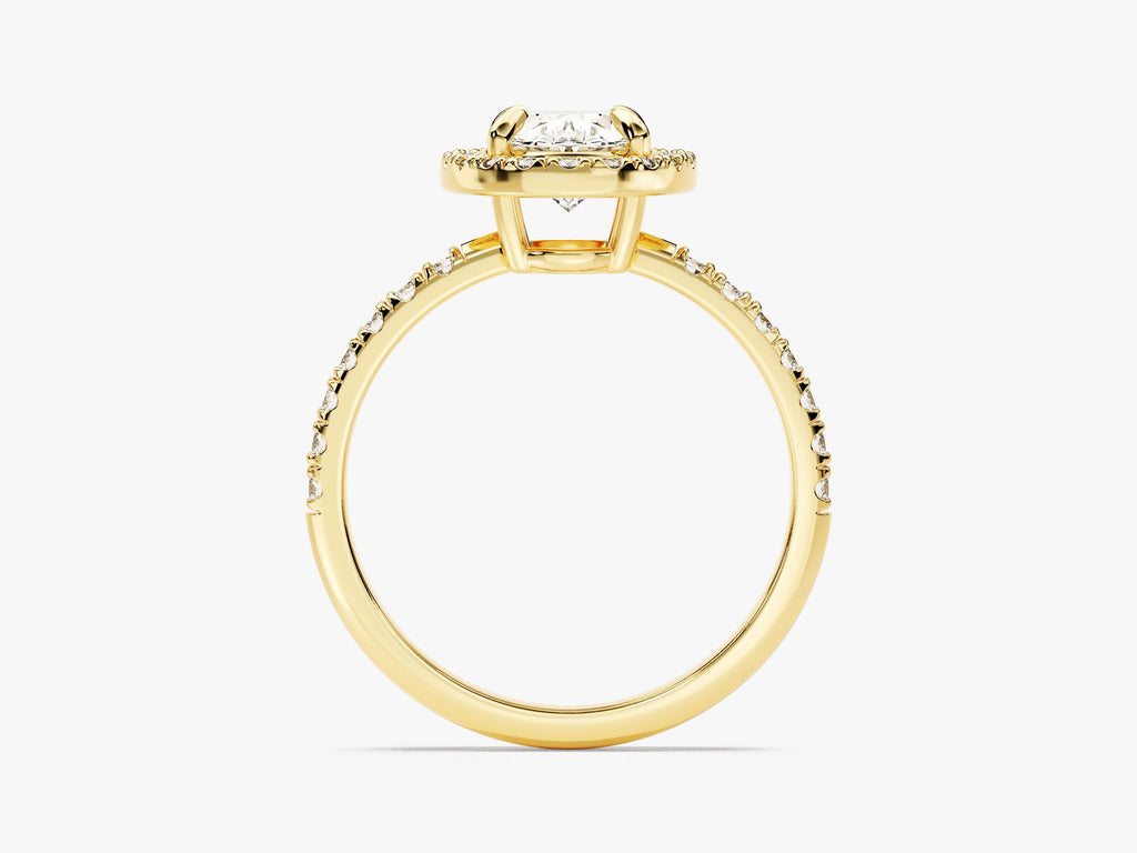 Embrace the profound beauty of our Oval Halo Diamond Engagement Ring with Pave Set Side Stones, a stunning embodiment of classic allure with a contemporary twist. This extraordinary ring showcases a brilliant oval-cut diamond, meticulously created to emphasize its remarkable clarity and mesmerizing charm. The intricate halo setting and pave set side stones add a modern and refined touch.