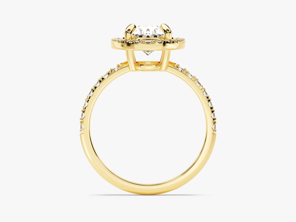 Experience the profound allure of our Oval Halo Diamond Engagement Ring with Pave Set Side Stones, a harmonious fusion of timeless elegance and contemporary refinement. At its core, a dazzling oval-cut diamond takes center stage, designed to captivate with its remarkable clarity and distinctive allure. The intricate halo setting and pave set side stones create an atmosphere of brilliance and sophistication.