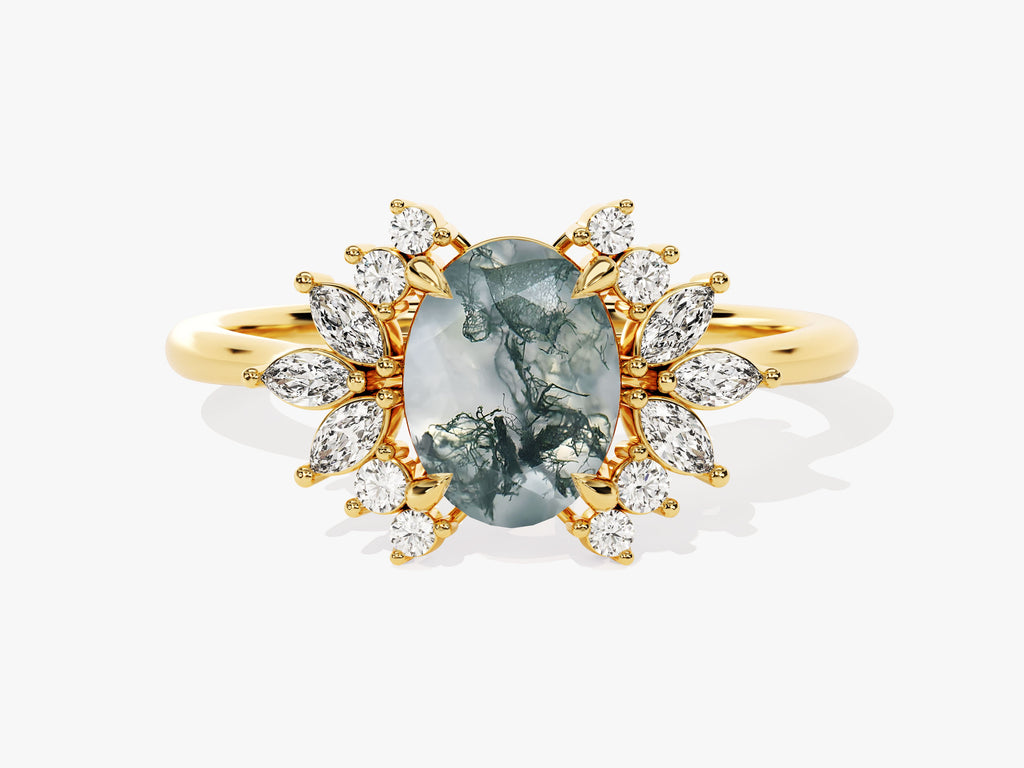 Oval Moss Agate Engagement Ring with Moissanite Cluster