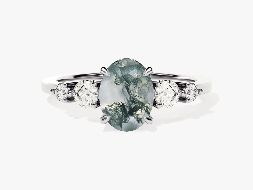 Oval Moss Agate Engagement Ring with Moissanite Sidestones
