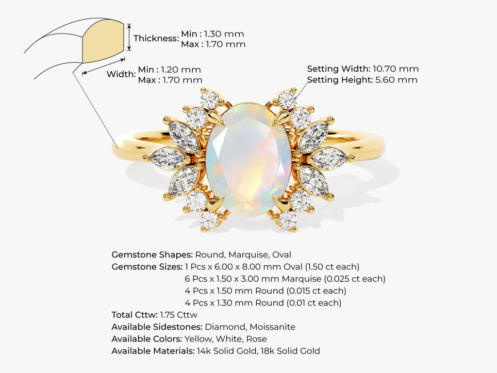 Indulge in the mesmerizing beauty of our Oval Opal Engagement Ring‚ ethereal symbol of love and enchantment. The captivating oval-cut opal, with its play of colors reminiscent of a magical dreamscape, takes center stage, infusing your love story with a touch of whimsy. Surrounding this enchanting gem is a cluster of brilliant moissanites, forming a constellation of sparkling light that adds a celestial aura to the ring.