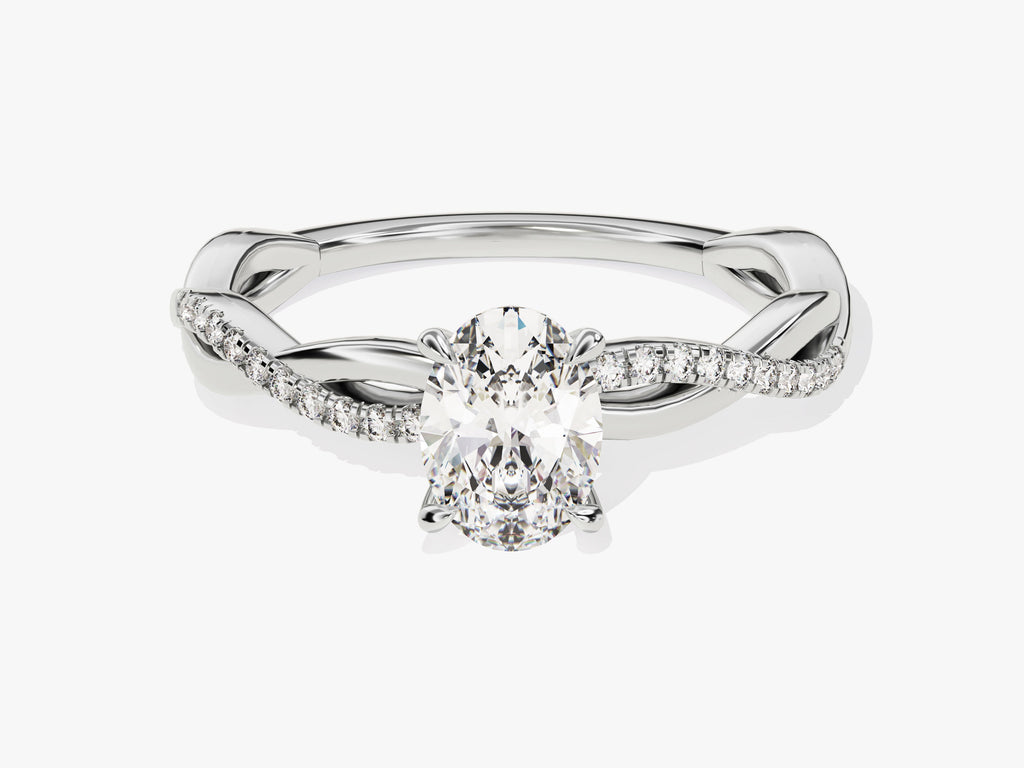 Behold the enchantment of the Oval Twisted Lab Grown Diamond Engagement Ring with Pave Set Side Stones, a harmonious union of classic allure with a contemporary twist. This extraordinary ring showcases a brilliant oval-cut lab-grown diamond, created to emphasize its remarkable clarity and mesmerizing charm. The unique twisted band design adds a modern and refined touch, symbolizing the intricate and intertwined nature of your love.