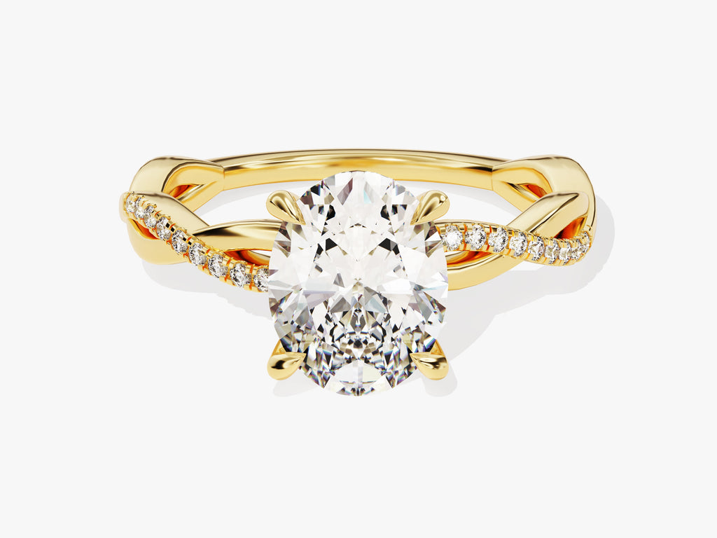 Step into a world of enchantment with our Oval Twisted Moissanite Engagement Ring featuring Pave Set Side Stones. This ring is a true masterpiece, seamlessly fusing contemporary elegance with a twist of artistic design. The star of the show is the exquisite oval-cut moissanite, which captures hearts with its radiant beauty. The twisted band design is a symbol of the winding path that led you to each other.