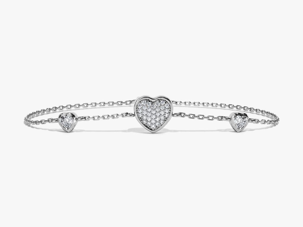 A shimmering pavé-set heart sparkles at the center, framed by two smooth hearts for a perfect balance of brilliance and elegance. Together, they tell a story of love.