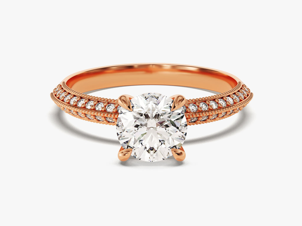 A stunning vintage side stone engagement ring with the 1.00-carat center stone and milgrain details that add elegance. It's the perfect choice for a bride who loves antique aesthetics.