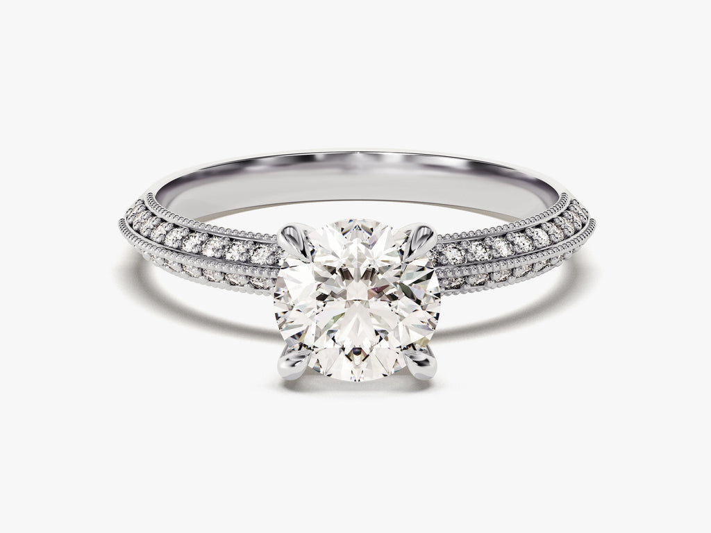 A stunning vintage side stone engagement ring with the 1.00-carat center stone and milgrain details that add elegance. It's the perfect choice for a bride who loves antique aesthetics.