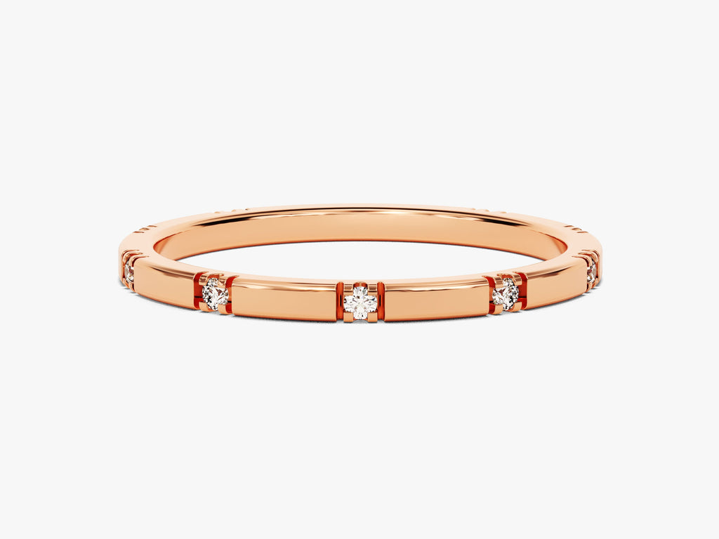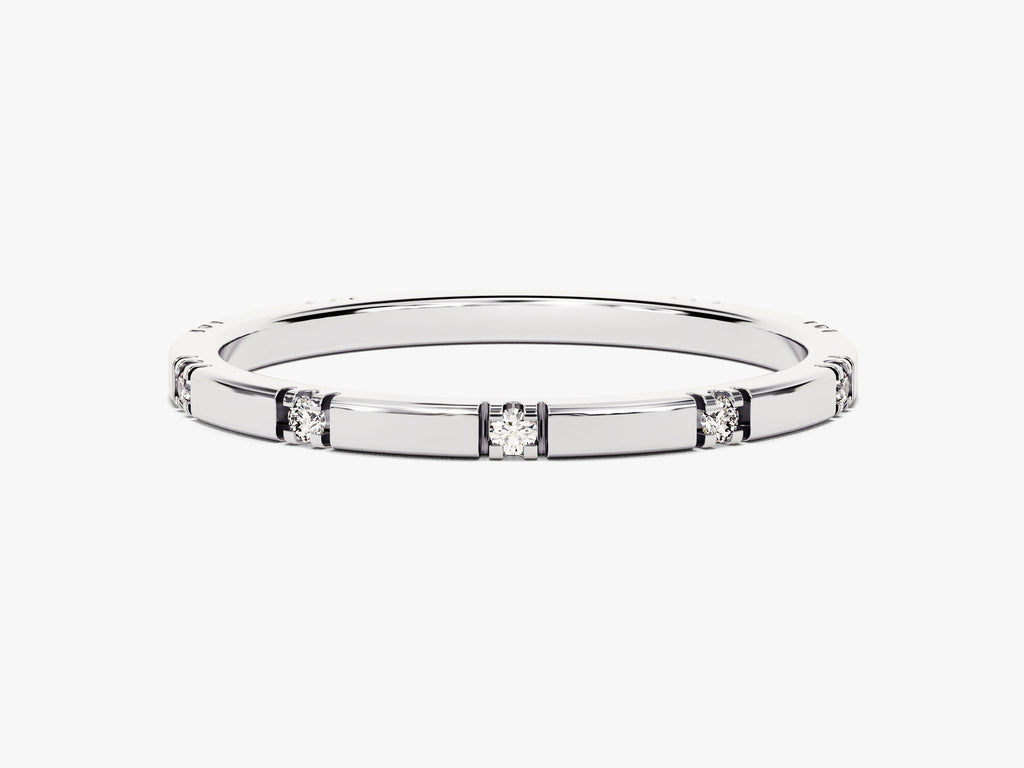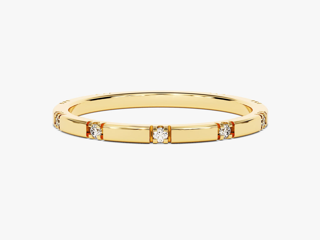 The Pave Set Nine-Stone Ring is a sleek and contemporary masterpiece that seamlessly matches modern design with timeless elegance. Meticulously crafted from gold vermeil, sterling silver or solid gold, this ring showcases a striking row of nine diamonds or moissanite, each flush-set into the band, creating a sleek and captivating effect.