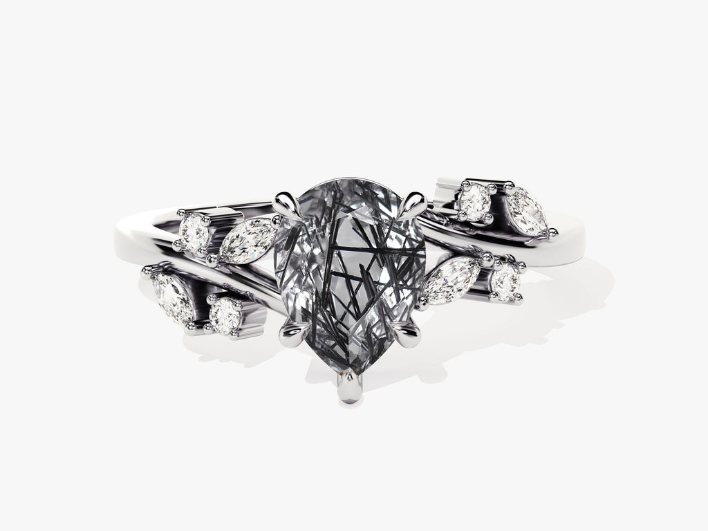 Pear Black Rutilated Quartz Engagement Ring with Moissanite Cluster