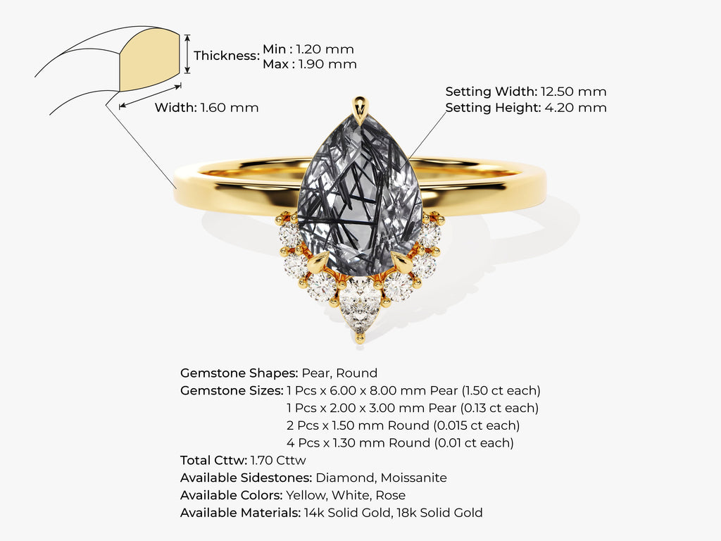 Embrace the mystique of love with our Pear Black Rutile Vintage Engagement Ring, a captivating creation adorned with the brilliance of moissanite. The pear-shaped Black Rutile gemstone, reminiscent of a cosmic dance, weaves a story of depth and intrigue within its inky depths. Set in a vintage-inspired embrace, this ring is a timeless ode to bygone eras, marrying the allure of the past with the promise of the future.
