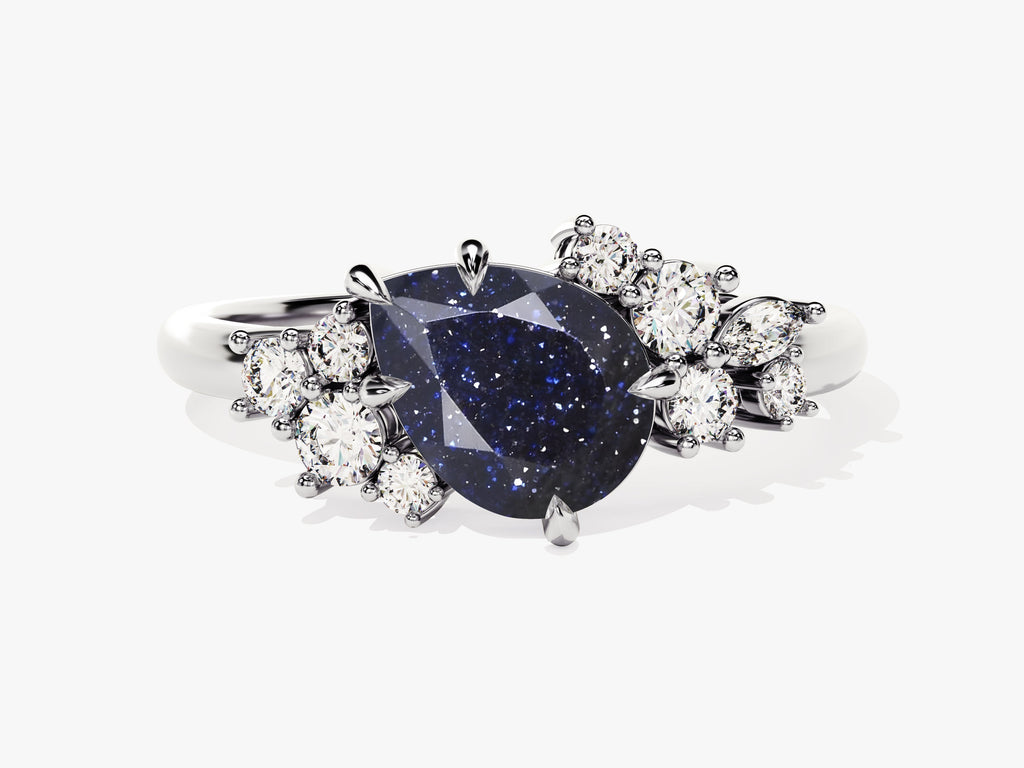 Pear Blue Sandstone Engagement Ring with Round Moissanite Cluster