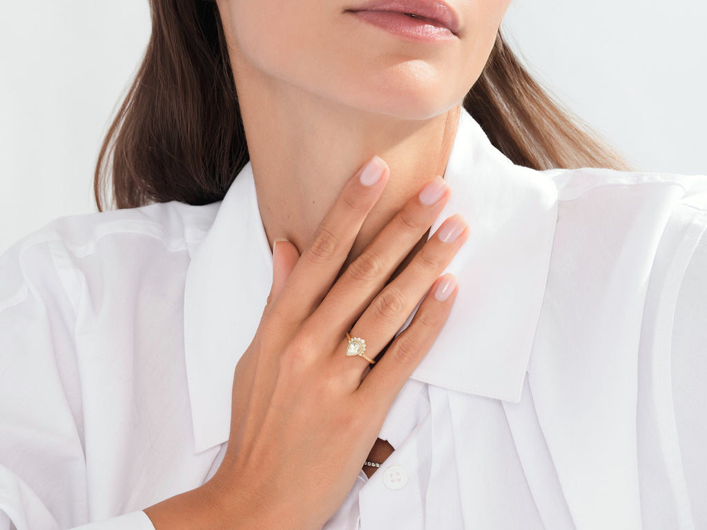 Regal yet refined, this design features a pear-cut stone set in a delicate crown-inspired setting. Its graceful curves and captivating sparkle evoke timeless elegance with a modern touch.