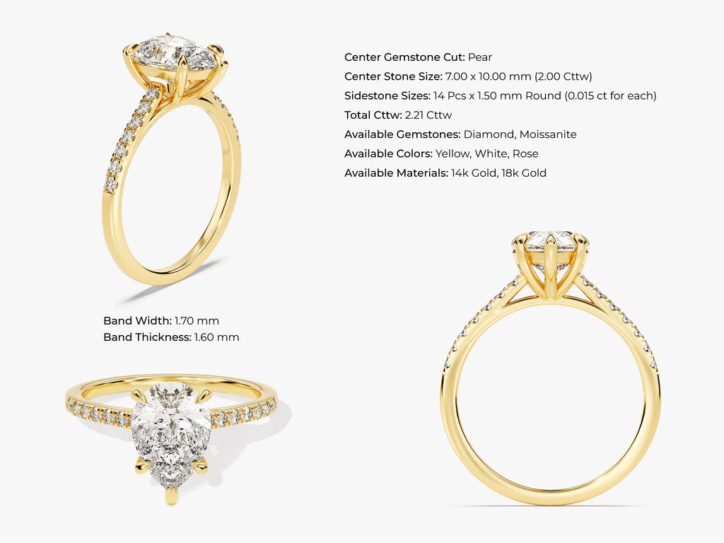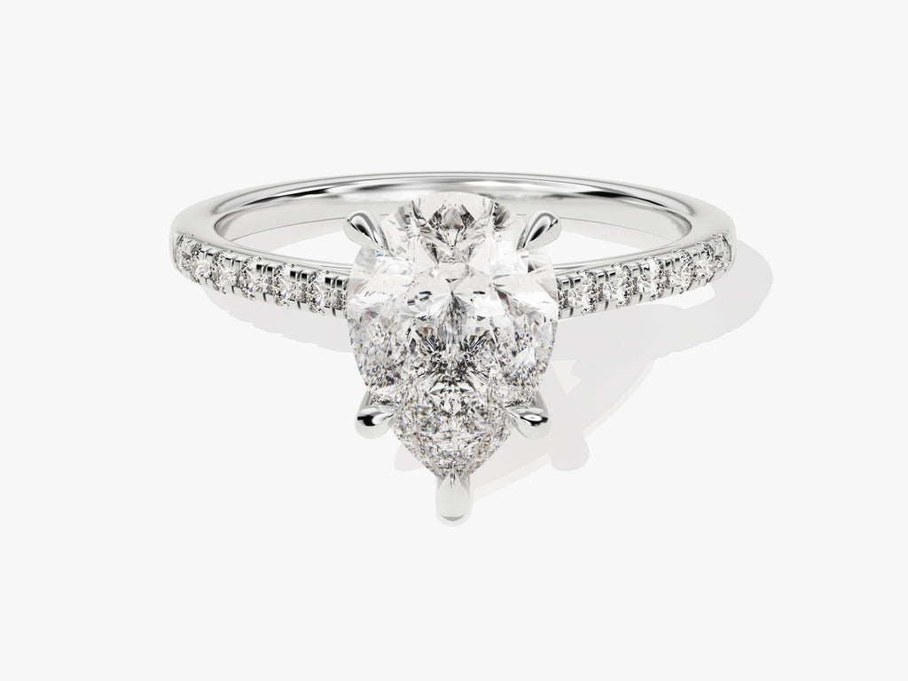 Discover the epitome of refined elegance with our Pear Cut Moissanite Engagement Ring, accented by Pave Set Side Stones. This ring redefines classic beauty by showcasing a breathtaking pear-cut moissanite center stone. The band is artistically adorned with pave set side stones that twinkle like stars in the night sky, creating a sense of timeless romance.