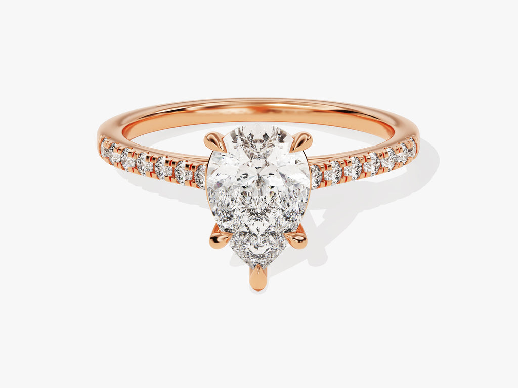 Celebrate your commitment in style with the Pear Cut Diamond Engagement Ring featuring pave set side stones, a harmonious fusion of elegance and contemporary refinement. At its heart, a dazzling pear-cut diamond takes center stage, designed to captivate with its remarkable clarity and distinctive allure.