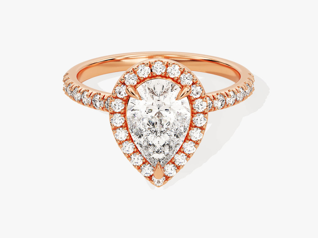 Embrace the profound allure of our Pear Halo Lab Grown Diamond Engagement Ring with Pave Set Side Stones, a harmonious union of classic charm with a contemporary twist. This extraordinary ring showcases a brilliant pear-cut lab-grown diamond, meticulously created to emphasize its remarkable clarity and mesmerizing charm.