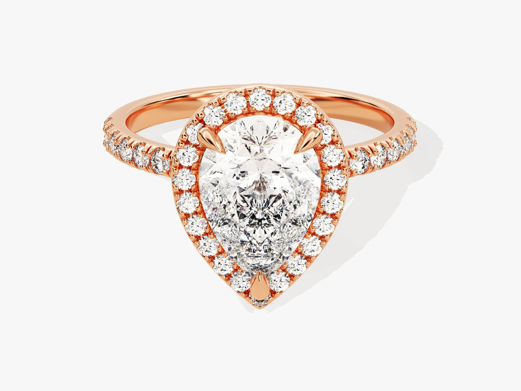 Experience the profound allure of our Pear Halo Lab Grown Diamond Engagement Ring with Pave Set Side Stones. At its core, a dazzling pear-cut lab-grown diamond takes center stage, designed to captivate with its remarkable clarity and distinctive allure. The intricate halo setting, featuring ethically sourced pave diamonds, creates an atmosphere of brilliance and elegance.
