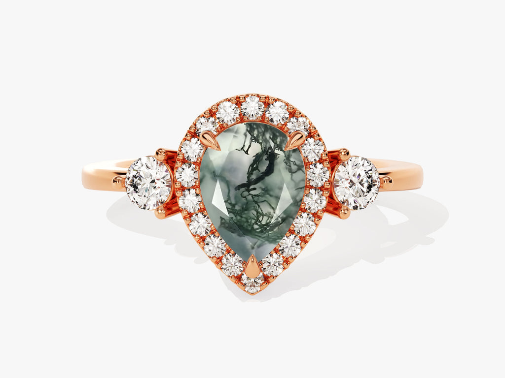 Pear Halo Moss Agate Engagement Ring with Moissanite Sidestones