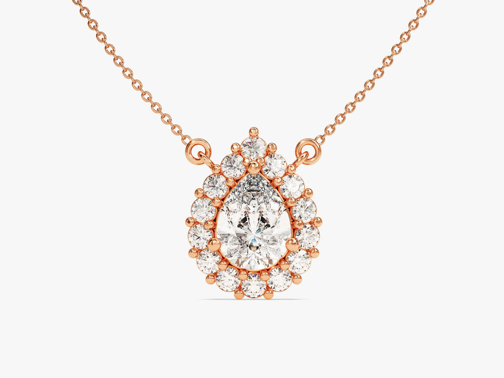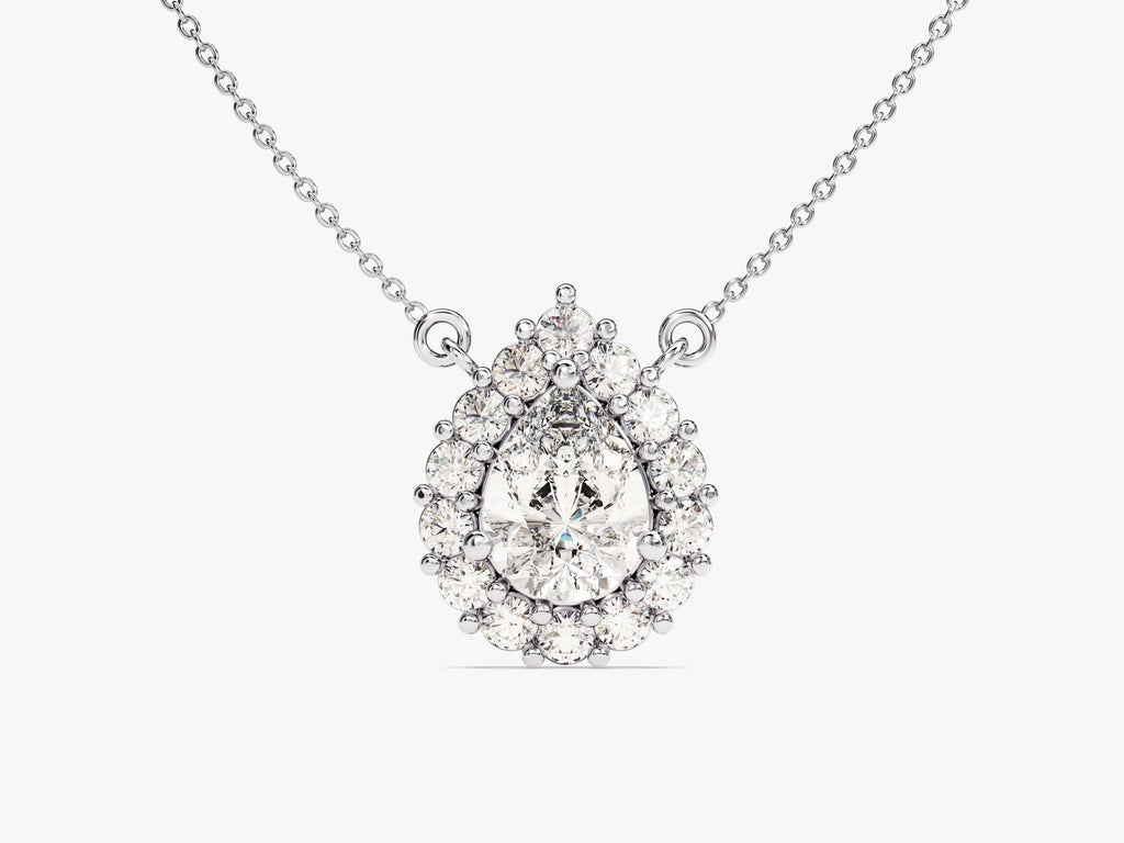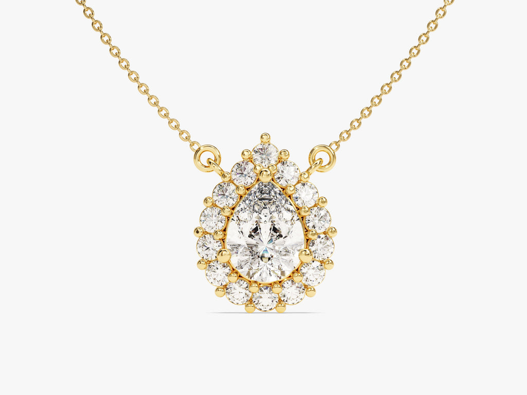 This luxurious Pear Halo Necklace is exquisitely crafted in solid gold, gold vermeil or sterling silver for a look of premium elegance. Featuring a diamond - moissanite studded halo design around a vibrant pear-shaped stone, this stunning piece is sure to grace your look with exquisite beauty.
