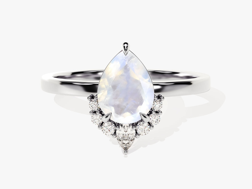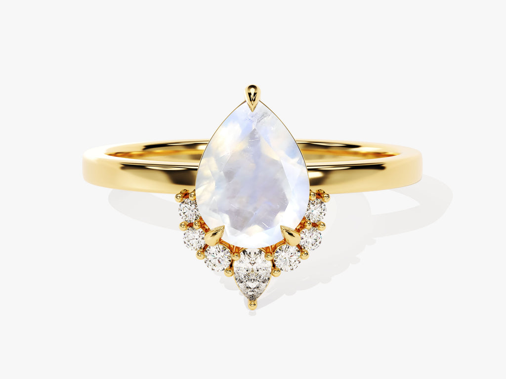 Set within a vintage-inspired design, this ring is a testament to the enduring allure of bygone eras, where every curve tells a story and every facet captures a moment.The pear-shaped Moonstone, with its ethereal glow, whispers the secrets of your unique love story.