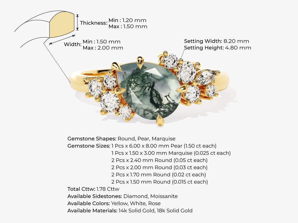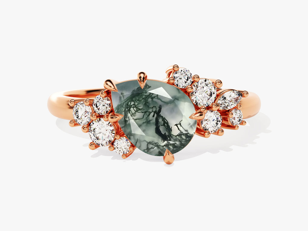 The Pear Moss Agate Engagement Ring with Round Moissanite Cluster is a nature-inspired masterpiece that blends earthy elegance with timeless sparkle. At its heart is a captivating pear-shaped moss agate, celebrated for its intricate patterns resembling a tranquil moss-covered landscape within a crystal canvas. This gemstone becomes the focal point, symbolizing the beauty of nature and the uniqueness of your love story.