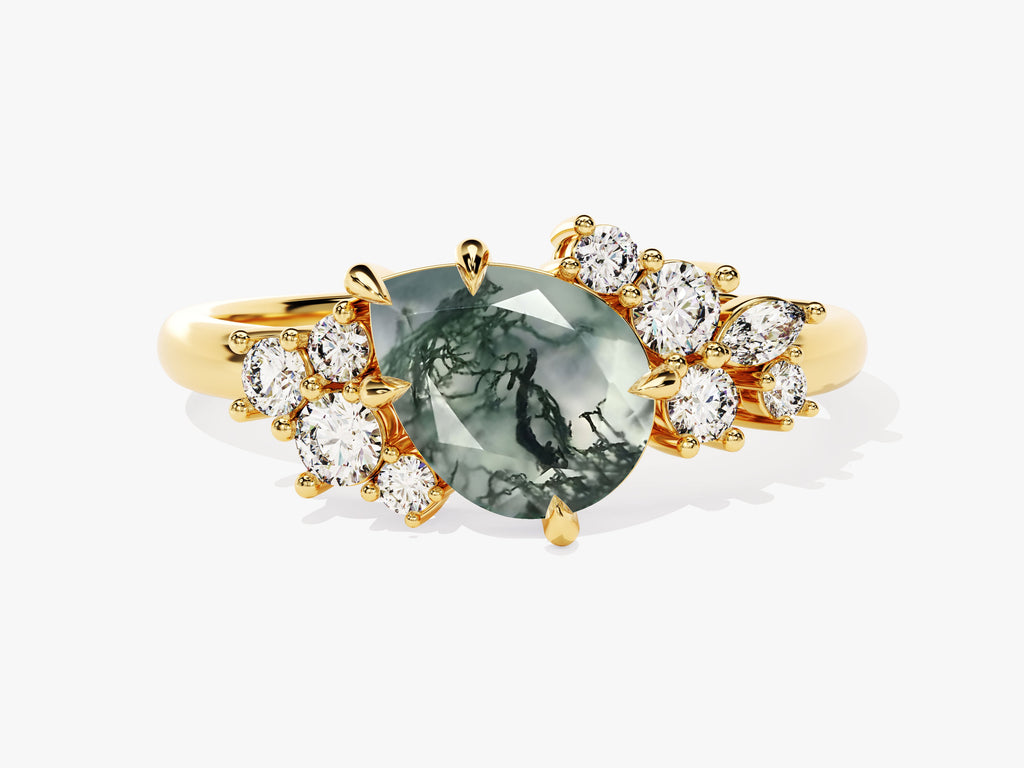 Pear Moss Agate Engagement Ring with Round Moissanite Cluster