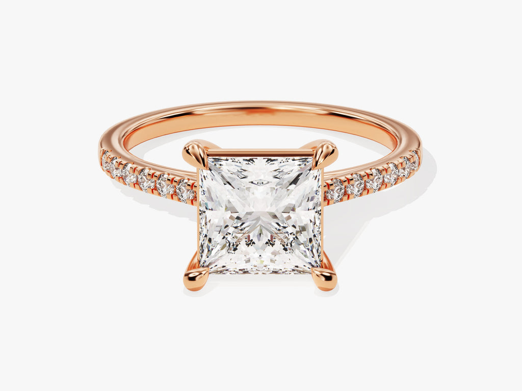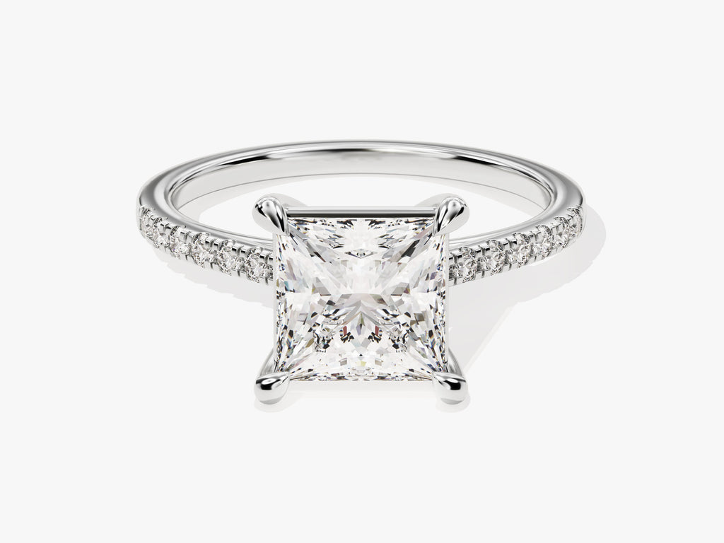 Elevate your love to new heights with our Princess Cut Lab Grown Diamond Engagement Ring. The resplendent princess-cut lab-grown diamond shines brilliantly, symbolizing the essence of your unique love story. The band features exquisite craftsmanship and is adorned with a stunning pave-set of side stones, adding an extra layer of sophistication and sparkle.