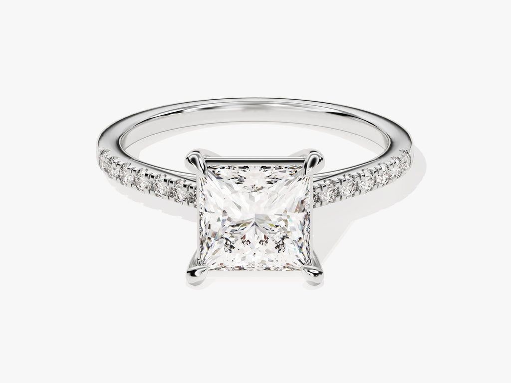 Step into a world of timeless elegance with our Princess Cut Moissanite Engagement Ring, beautifully adorned with Pave Set Side Stones. This exceptional ring is a masterpiece of contemporary sophistication, featuring a brilliant princess-cut moissanite center stone that exudes regal charm. The band, elegantly designed, is delicately encrusted with pave set side stones, creating a mesmerizing cascade of sparkle.