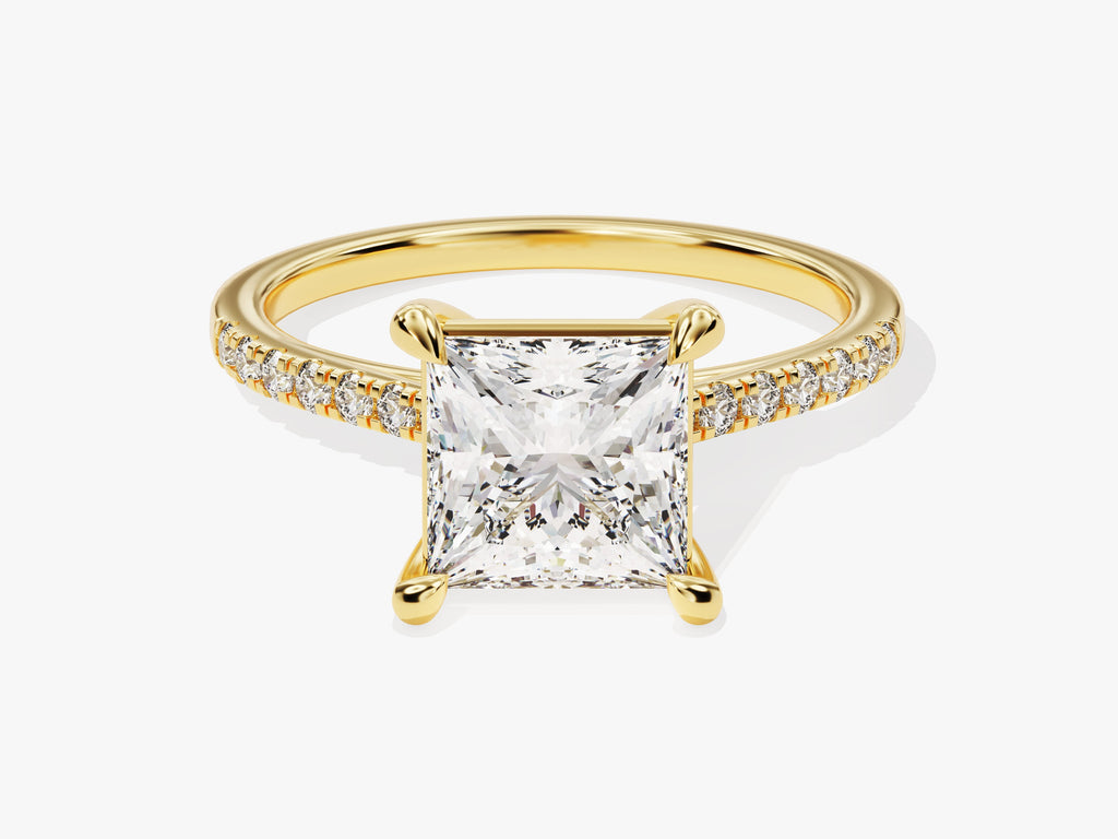 Soar to new heights of romance with our Princess Cut Diamond Engagement Ring. A magnificent princess-cut diamond is the heart of this extraordinary piece. The precisely crafted band is embellished with a dazzling pave setting of smaller diamonds. This ring is a testament to your extraordinary love story, promising a future as radiant as the diamond itself.