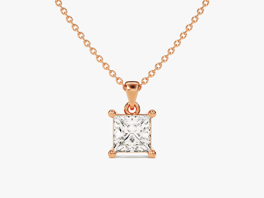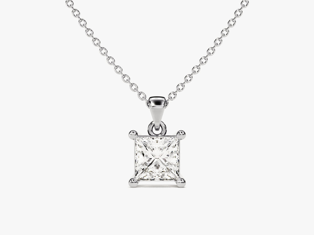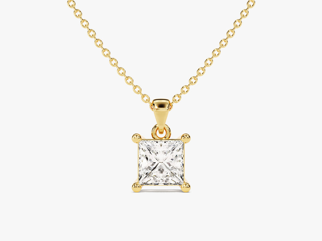 Designed to be the perfect match for any outfit, this pendant is elegant and glamorous. The princess-cut lab grown diamond or moissanite gives a sleek and polished look that is irresistible.