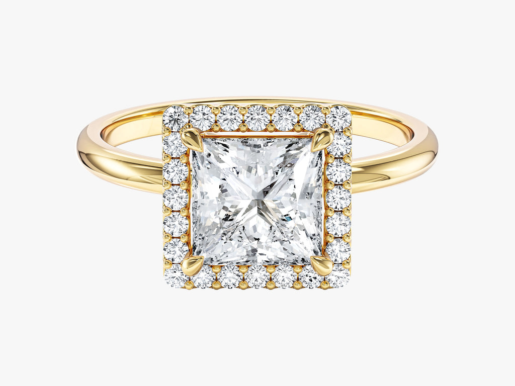 Illuminate your love with the radiance of our Princess Halo Lab Grown Diamond Engagement Ring. The exquisite princess-cut lab-grown diamond commands attention, encircled by a stunning halo of lab-grown diamonds that enhances its sparkle and magnificence.