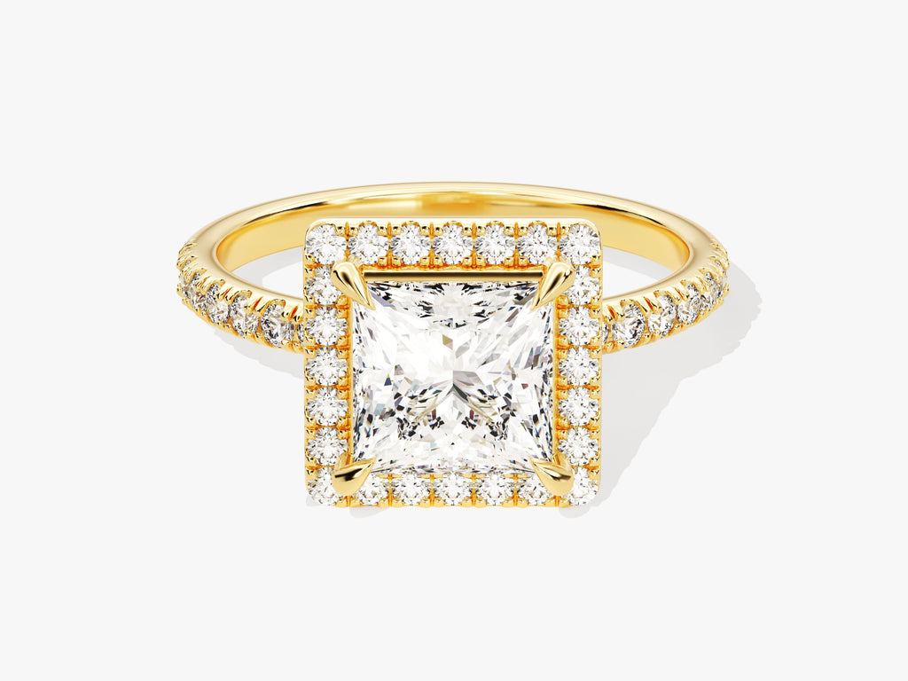 Indulge in the epitome of modern elegance with our Princess Halo Moissanite Engagement Ring, exquisitely adorned with Pave Set Side Stones. This extraordinary ring is a masterpiece that seamlessly blends contemporary sophistication with timeless allure. The captivating princess-cut moissanite center stone is surrounded by a luminous halo, adding a touch of regal charm and brilliance. What truly sets this ring apart is the meticulous pave set side stones that adorn the band, creating a dazzling cascade of sparkle.
