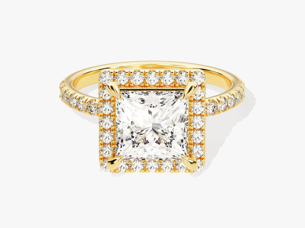 Elevate your love story to new heights with our Princess Halo Moissanite Engagement Ring, beautifully embellished with Pave Set Side Stones. This ring is a masterpiece of contemporary sophistication and timeless beauty, showcasing a dazzling princess-cut moissanite centerpiece that radiates with regal charm. The surrounding halo adds an enchanting touch to the ring's brilliance. The meticulously paved side stones that adorn the band contribute to the overall opulence, creating a mesmerizing cascade of sparkle.