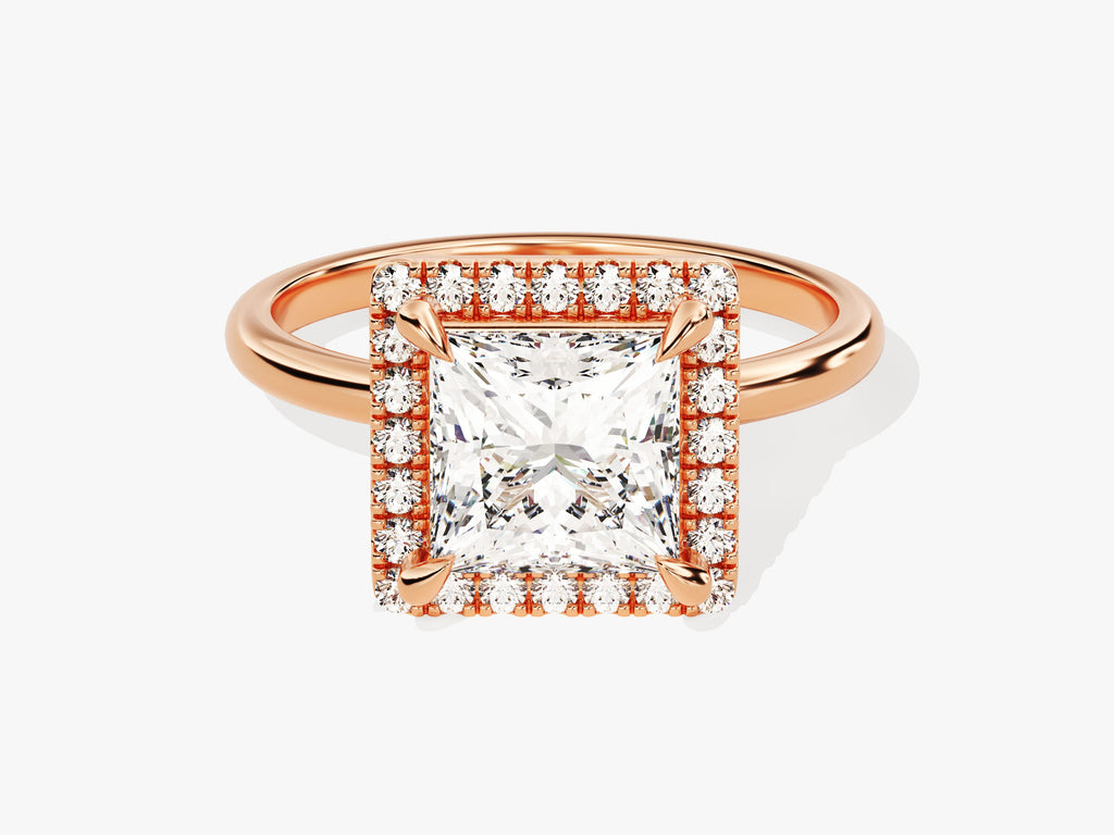 Cherish your beginning of forever with our Princess Halo Diamond Engagement Ring. The captivating princess-cut diamond is framed by a halo of smaller diamonds, creating a breathtaking display of brilliance and fire.