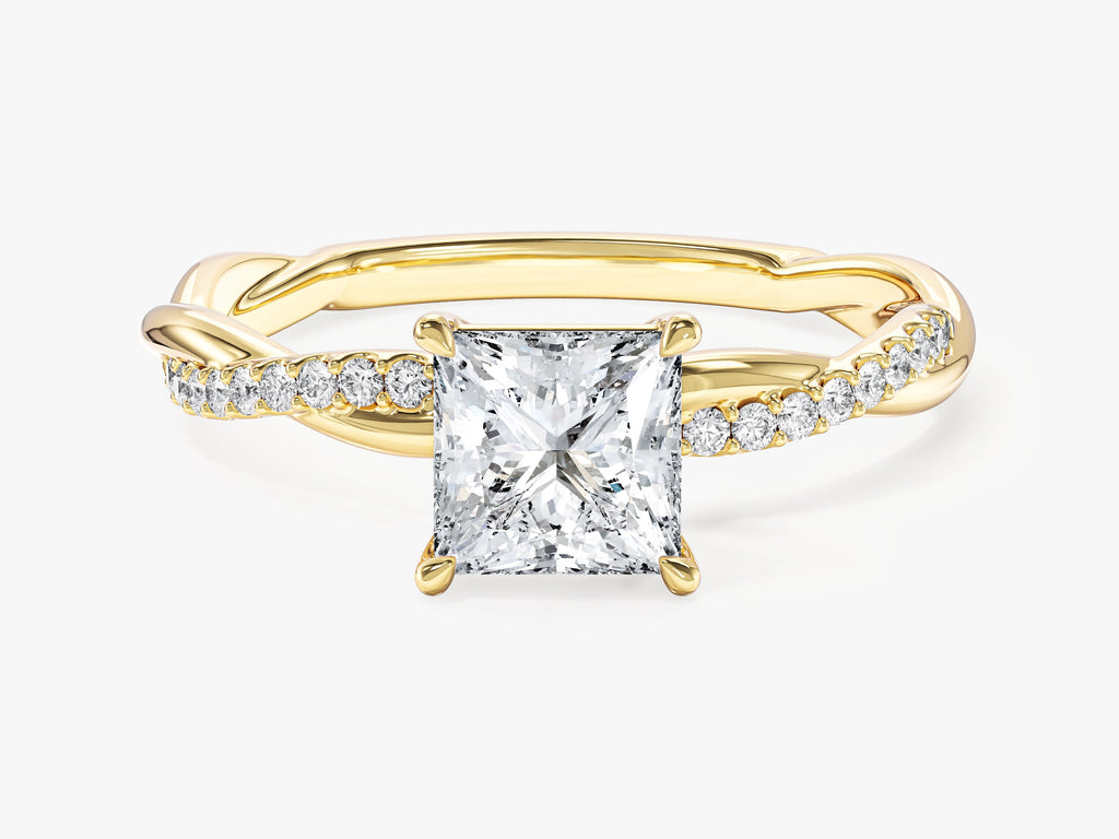 Unveil the enchanting beauty of our Princess Twisted Lab Grown Diamond Engagement Ring with Pave Set Side Stones, a symbol of your unique love story. The mesmerizing princess-cut lab-grown diamond graces the center, casting an aura of timeless elegance. The intricately twisted band adds a touch of individuality to this exquisite ring, while pave-set side stones offer a hint of opulence.