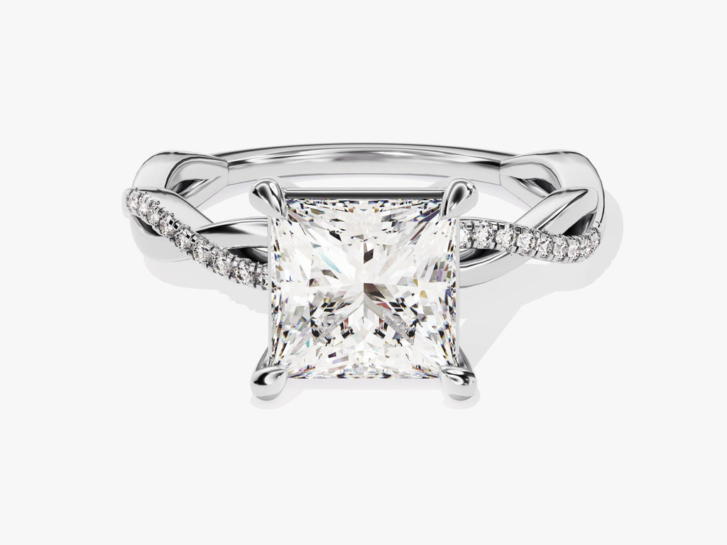 Elevate your love to new heights with our Princess Twisted Lab Grown Diamond Engagement Ring featuring Pave Set Side Stones. The intricately twisted band adds a touch of individuality to this elegant ring, while the pave-set side stones enhance its beauty with a hint of opulence and sophistication.