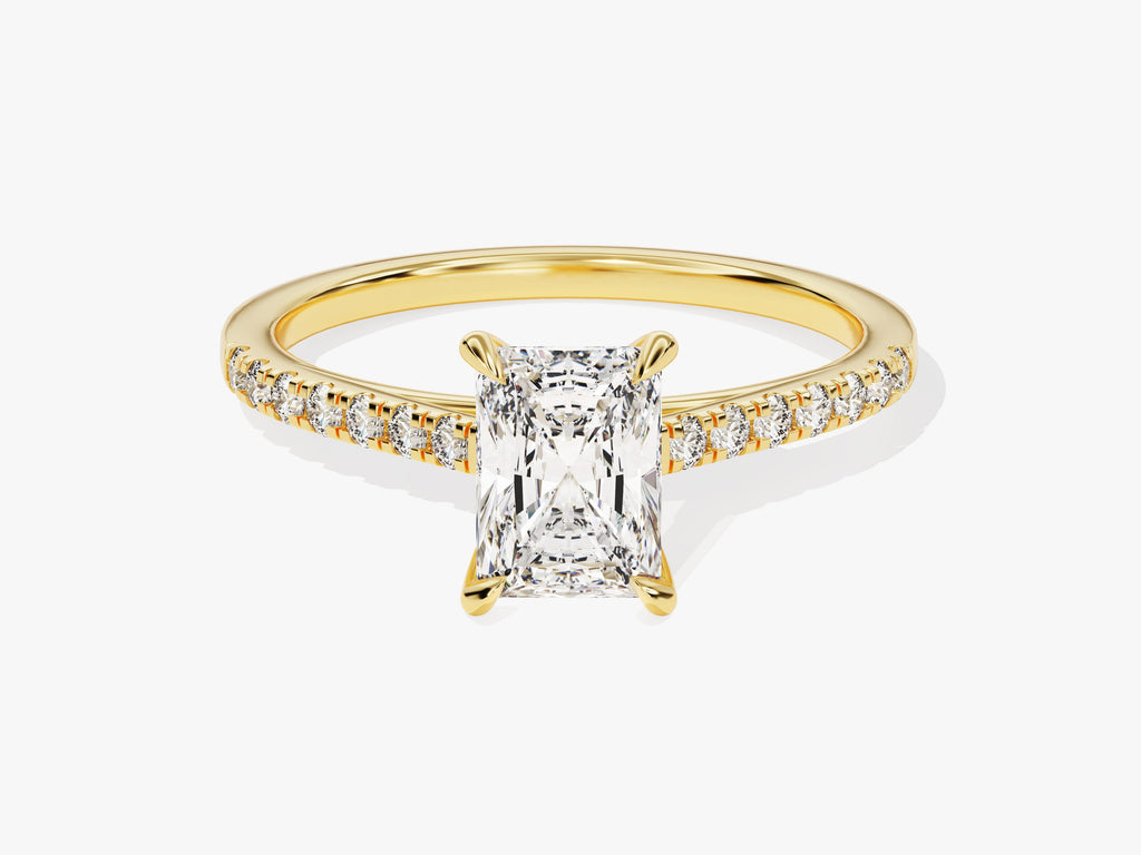 Revel in the brilliance of our Radiant Cut Lab Grown Diamond Engagement Ring with Pave Set Side Stones, a true testament to your enduring love. The dazzling radiant-cut lab-grown diamond takes center stage. The meticulously crafted band features pave-set side stones, adding a touch of opulence and sophistication to this exquisite ring.