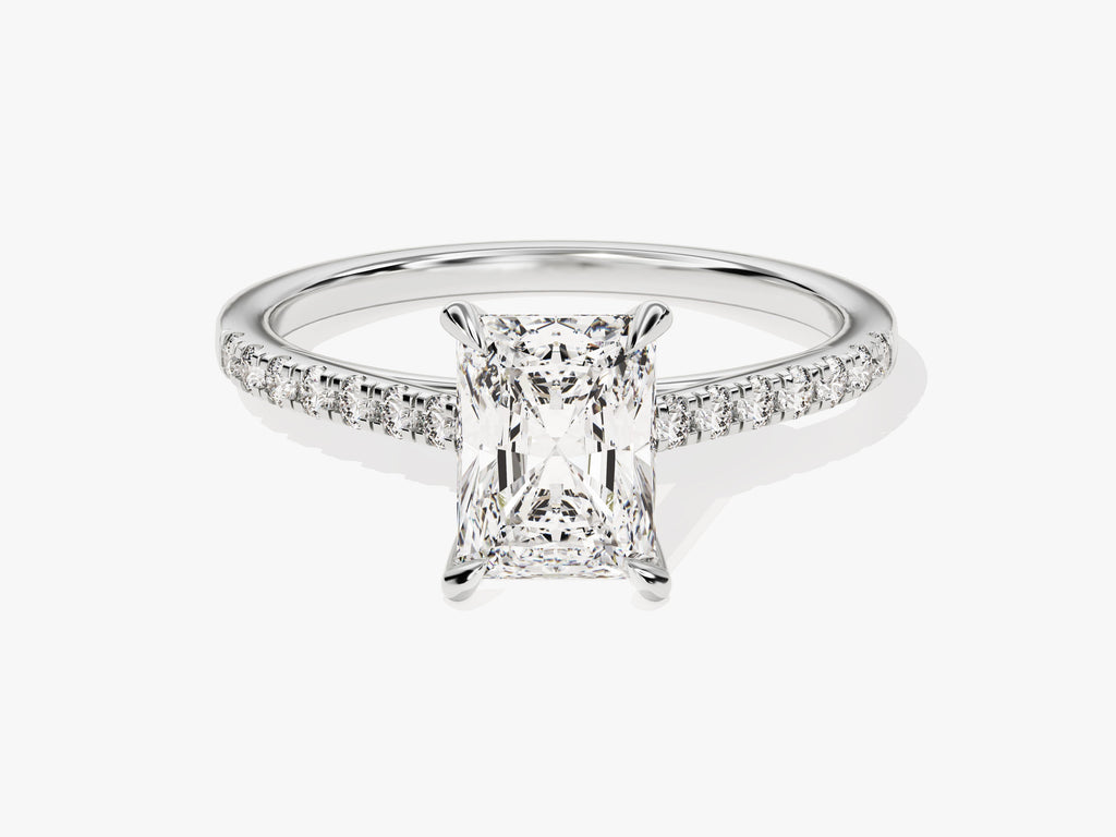 Embrace the enchantment of our Radiant Cut Lab Grown Diamond Engagement Ring, accentuated by Pave Set Side Stones, a masterpiece of love and sustainability. The striking radiant-cut lab-grown diamond is a focal point. The intricately designed band, adorned with pave-set side stones, adds a layer of charm to this extraordinary ring.