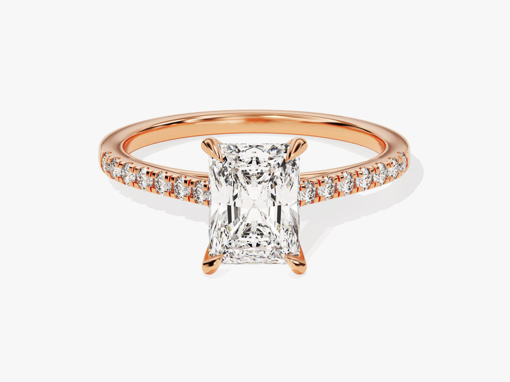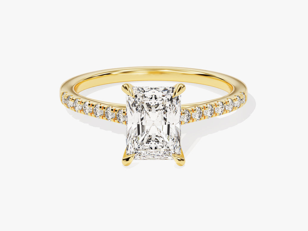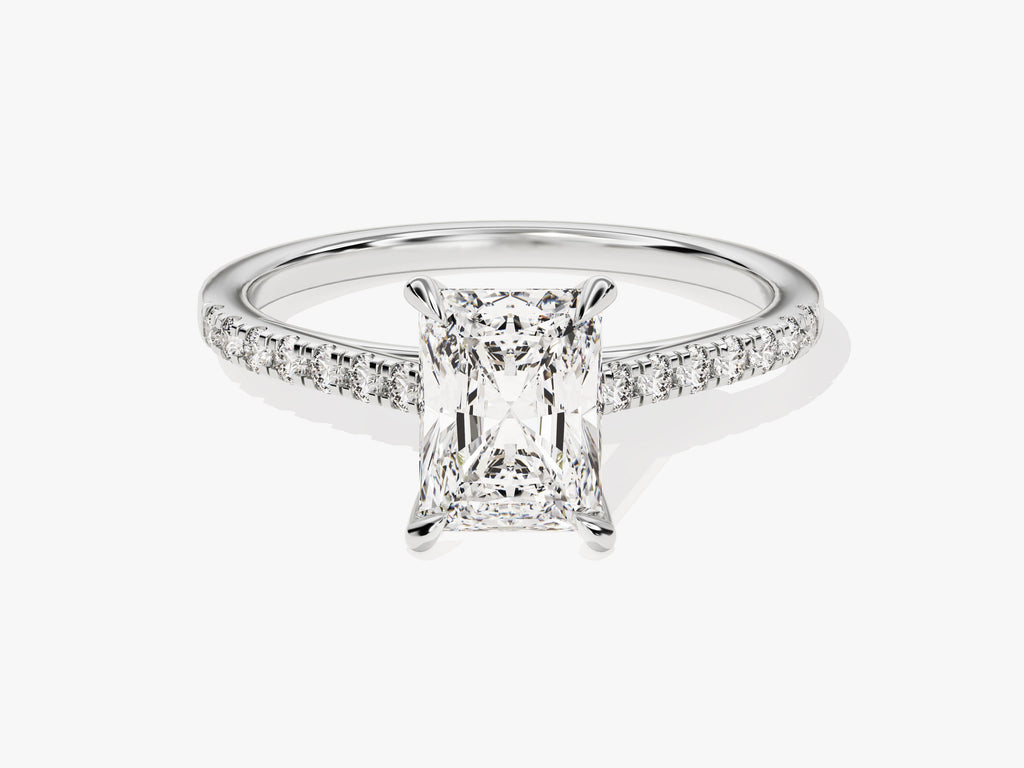 Embark on a journey of pure elegance with our Radiant Cut Moissanite Engagement Ring, elegantly adorned with Pave Set Side Stones. This extraordinary ring is a masterpiece of contemporary sophistication, featuring a radiant-cut moissanite center stone that exudes brilliance and charm. The meticulously paved side stones that adorn the band create a captivating display of sparkle.