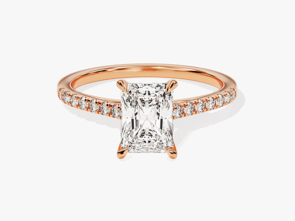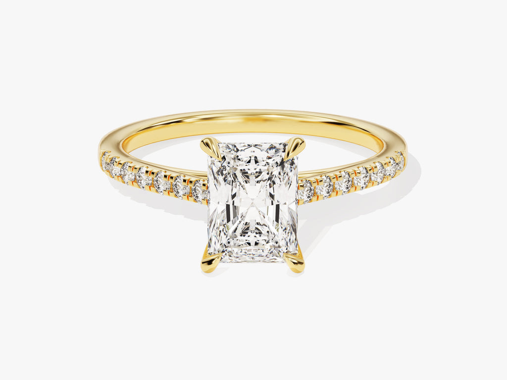 Embrace the enchantment of our Radiant Cut Diamond Engagement Ring, accentuated by pave set side stones. A captivating radiant-cut diamond takes center stage, its exceptional brilliance and fire symbolizing the passion of your love. The intricately designed band, adorned with pave-set diamonds, adds elegance and extra sparkle to the overall design.