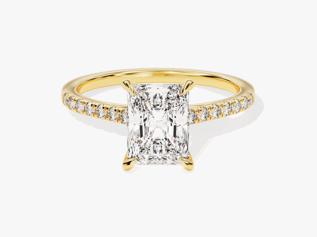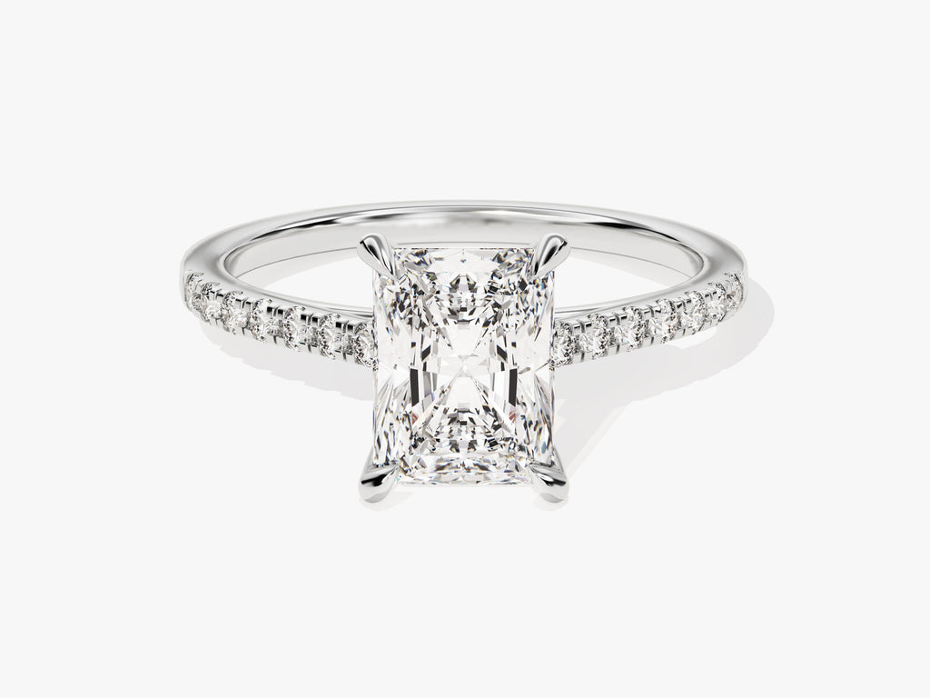 Mark your most happy moments with the radiant beauty of our Radiant Diamond Engagement Ring. A mesmerizing radiant-cut diamond takes center stage, capturing hearts with its exceptional brilliance and fiery sparkle. The exquisite band is delicately adorned with shimmering pave-set diamonds.