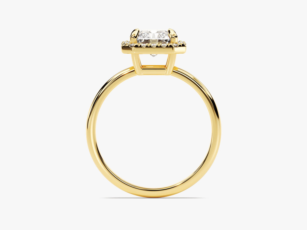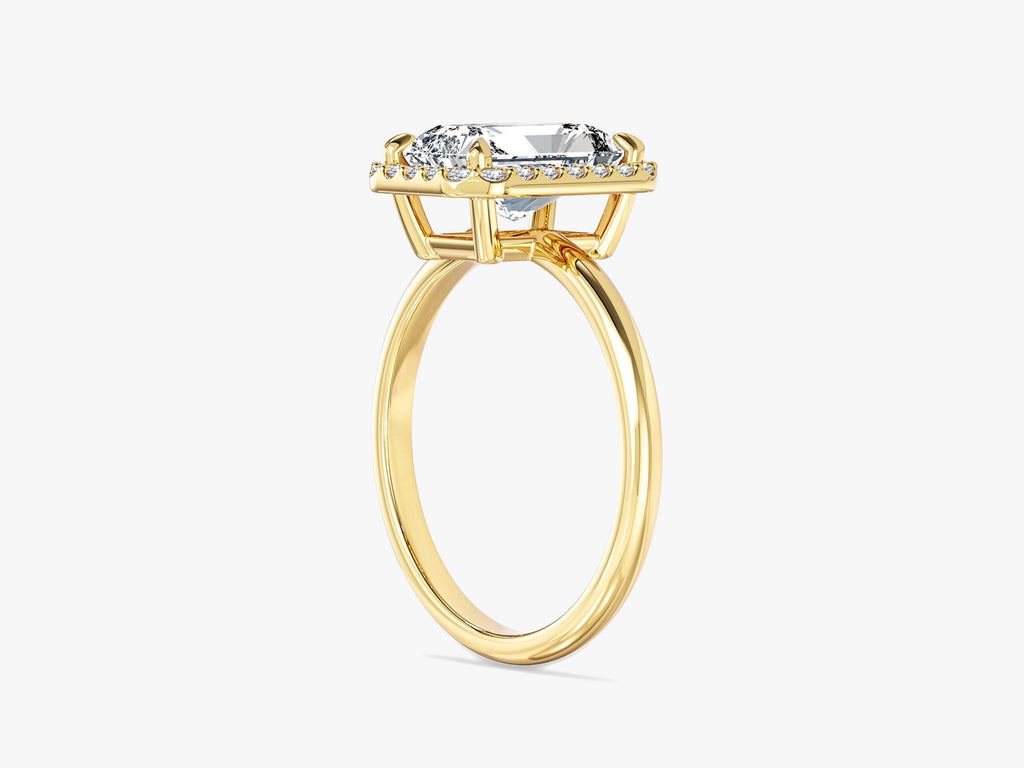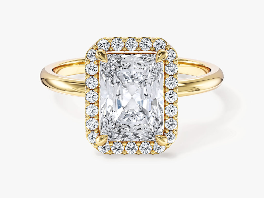 Elevate your love to new heights with our Radiant Halo Lab Grown Diamond Engagement Ring. The resplendent radiant-cut lab-grown diamond radiates with unmatched brilliance, framed by a shimmering halo of smaller lab-grown diamonds, creating an enchanting display of sparkle and magnificence.