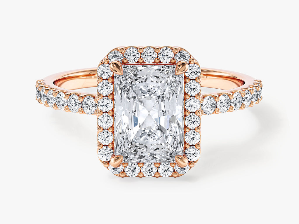 Embrace the enchantment of our Radiant Halo Lab Grown Diamond Engagement Ring with Pave Set Side Stones, a masterpiece of love and sustainability. The striking radiant-cut lab-grown diamond is the star of the show, encircled by a brilliant halo of smaller lab-grown diamonds that intensify its luminosity. The artistically designed band, adorned with pave-set side stones, adds a layer of elegance and charm to this extraordinary ring.