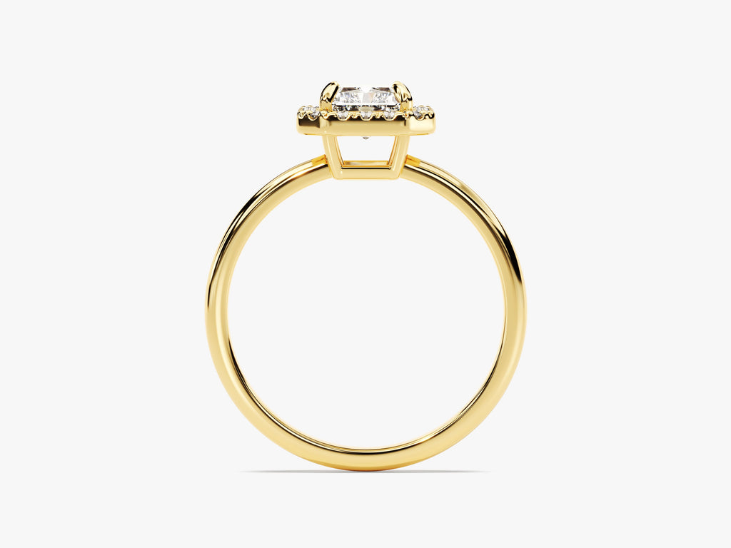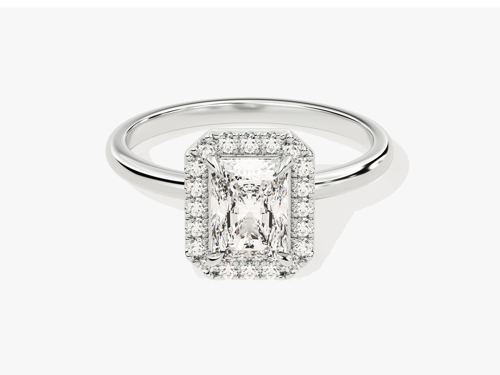 The Radiant Halo Moissanite Engagement Ring is a breathtaking and elegant symbol of love and commitment. At its heart, this exquisite ring features a brilliant radiant-cut moissanite, known for its rectangular shape with trimmed corners and remarkable brilliance. What makes this ring truly special is its halo setting, which encircles the central moissanite with a shimmering array of smaller stones. This halo not only enhances the ring's radiance but also adds a touch of classic elegance to the overall design.