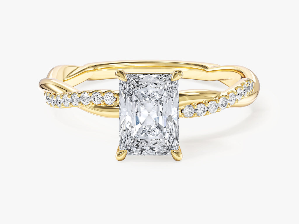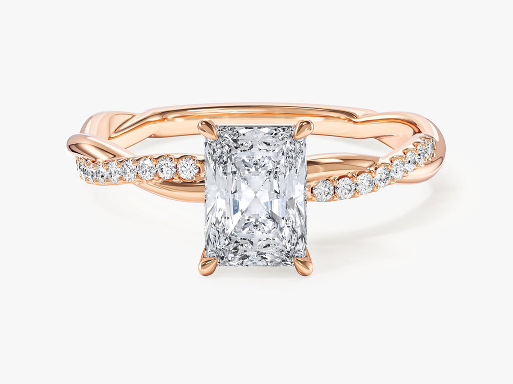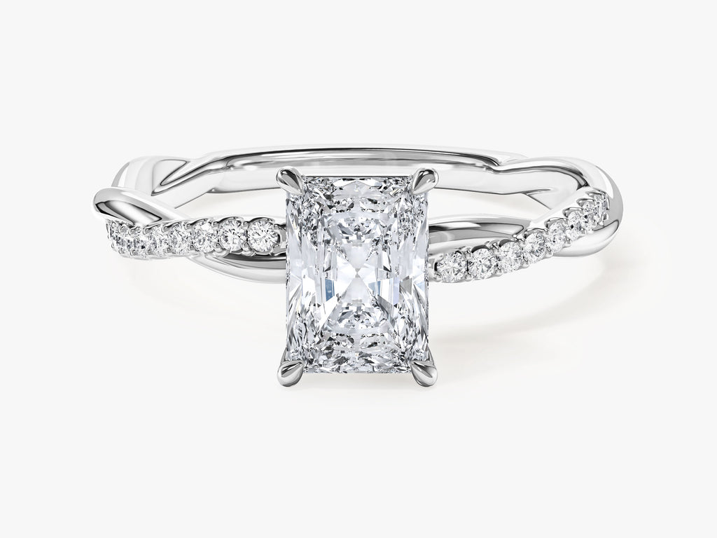 Experience the extraordinary beauty of our Radiant Twisted Lab Grown Diamond Engagement Ring with Pave Set Side Stones, a celebration of your unique love story. The brilliant radiant-cut lab-grown diamond takes center stage. The intricately twisted band symbolizes your intertwined destinies, and the pave-set side stones add a touch of opulence.