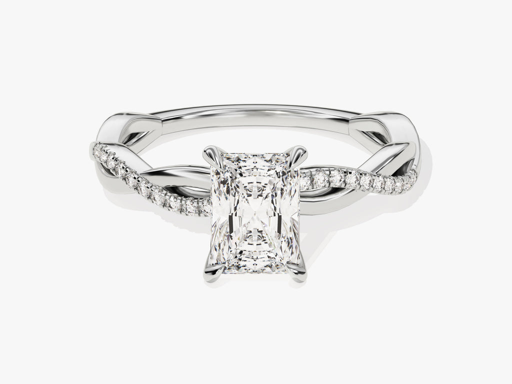 The Radiant Twisted Moissanite Engagement Ring with Pave Set Side Stones is a captivating and unique symbol of love and commitment. This exquisite ring showcases a brilliant radiant-cut moissanite, renowned for its rectangular shape with trimmed corners and remarkable brilliance. It has an intricate twisted band design, adding a touch of individuality and romantic flair to the classic solitaire style. Along the band, small moissanite stones are meticulously set using the paving technique.