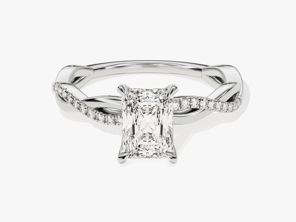 Experience the extraordinary beauty of our Radiant Twisted Diamond Engagement Ring with Pave Set Side Stones, a celebration of your unique love story. The brilliant radiant-cut diamond takes center stage. The intricately twisted band symbolizes your intertwined destinies, and the pave-set side stones add a touch of opulence.