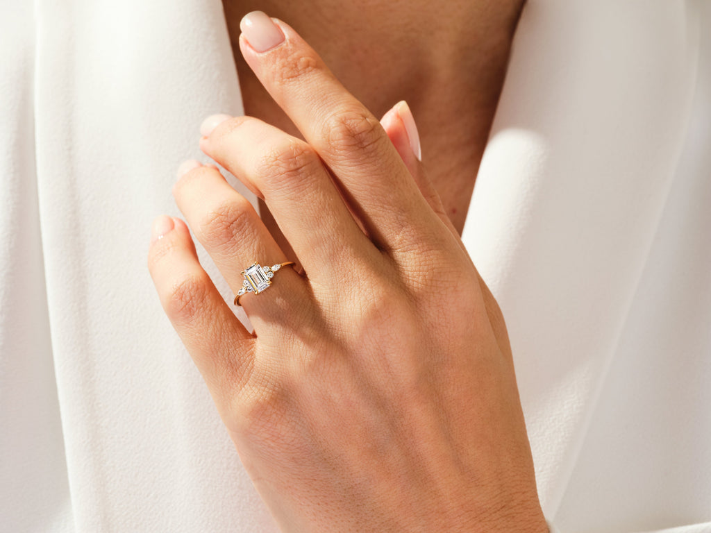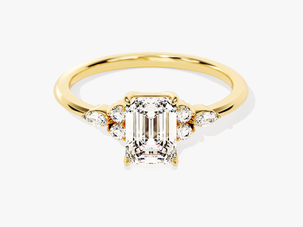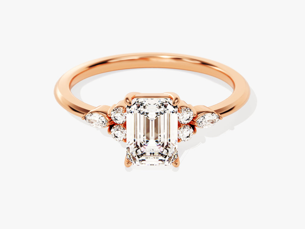 The Round and Marquise Cluster Emerald Moissanite Engagement Ring is a distinctive and captivating piece that artfully combines classic and contemporary design elements. This ring features a stunning cluster arrangement of moissanite gemstones, creating a dynamic and eye-catching appearance.